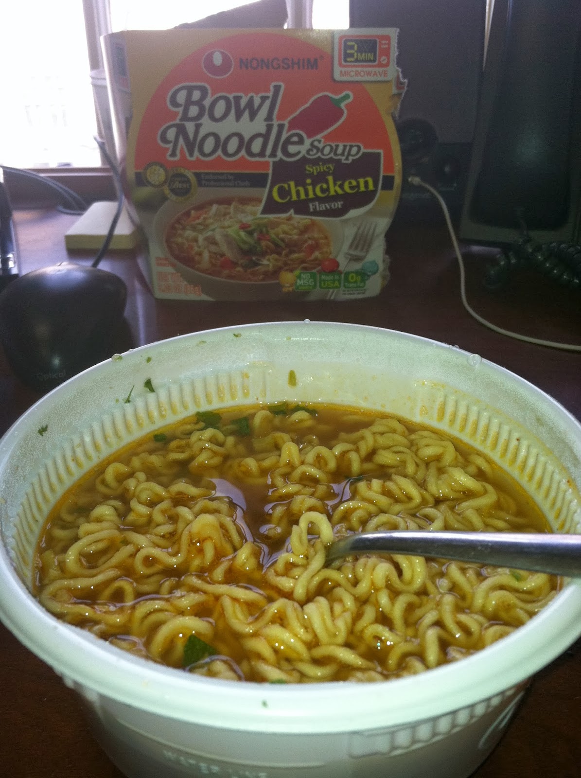 A big pat on the back goes to the marketers of this brand because I was really reeled in by the tantalizing chicken pieces and the vibrancy of the fresh green onions. The morning of my meal prep I thought nothing of tossing this along with my teas, chocolates, yogurt, snack bar, spoon, fork, papertowls and tangerines into my lunch bag. Had it have been the ramen noodles I would have 1) been mentally prepared for ramen noodles 2) I probably would not have brought it for lunch and/or 3)I would have brought some embellishments to add to it.